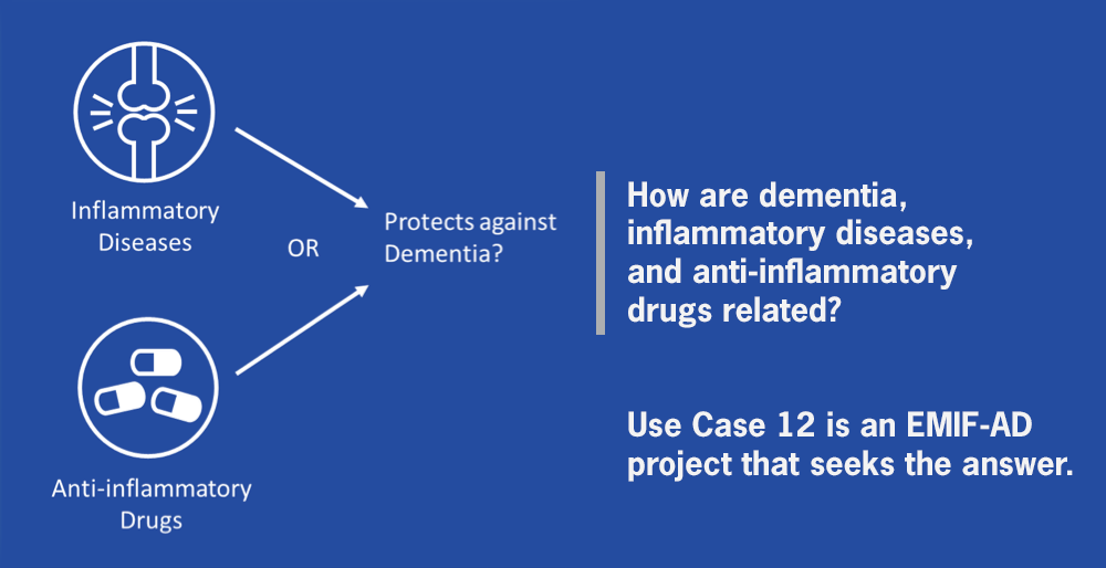 Use Case 12 is utilizing EMIF’s visible, accessible, harmonized datasets to complete ground-breaking research about whether inflammatory diseases or the drugs used to treat them change the risk of dementia in later life. |